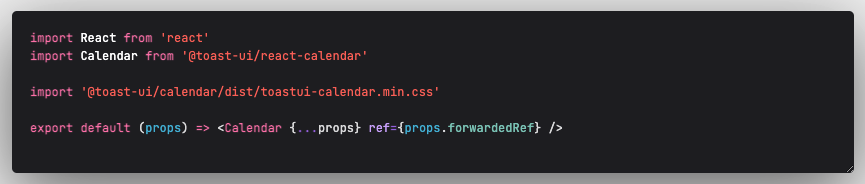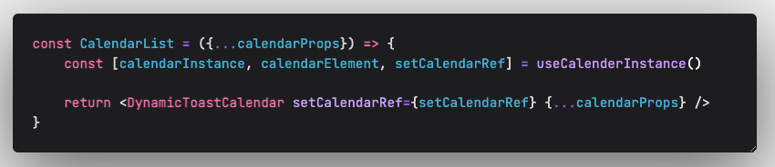 이렇게 두가지로 분리하니, 현재는 하나의 페이지 컴포넌트에서 캘린더 인스턴스를 필요로 할수있어 위와 같이 세단계로 분리하여 작성하였다.