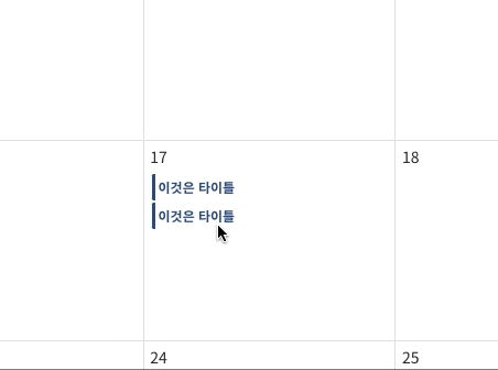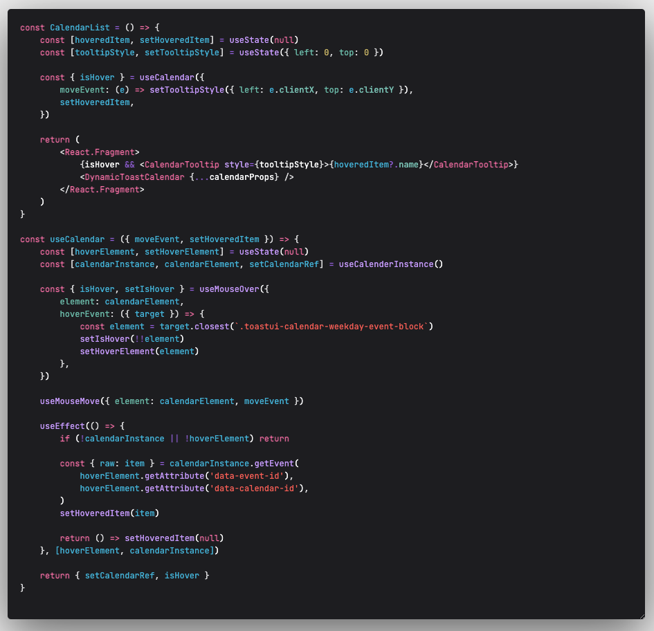 그렇게 해당 id와 calendarId를 가진 요소를 만나면 isHover 상태변경 트리거하는 로직을 작성해서 Next.js 환경에서 Toast Calendar 에 커스텀 이벤트를 붙이는 작업을 완성해냈다.