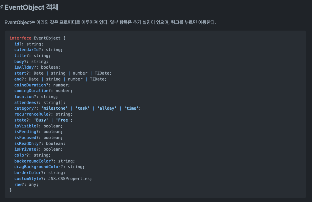 Toast Calendar Event Object 공식문서다. 여기에 캘린더에 들어가야할 요소들을 정의하는 타입이 정의되어 있다.
