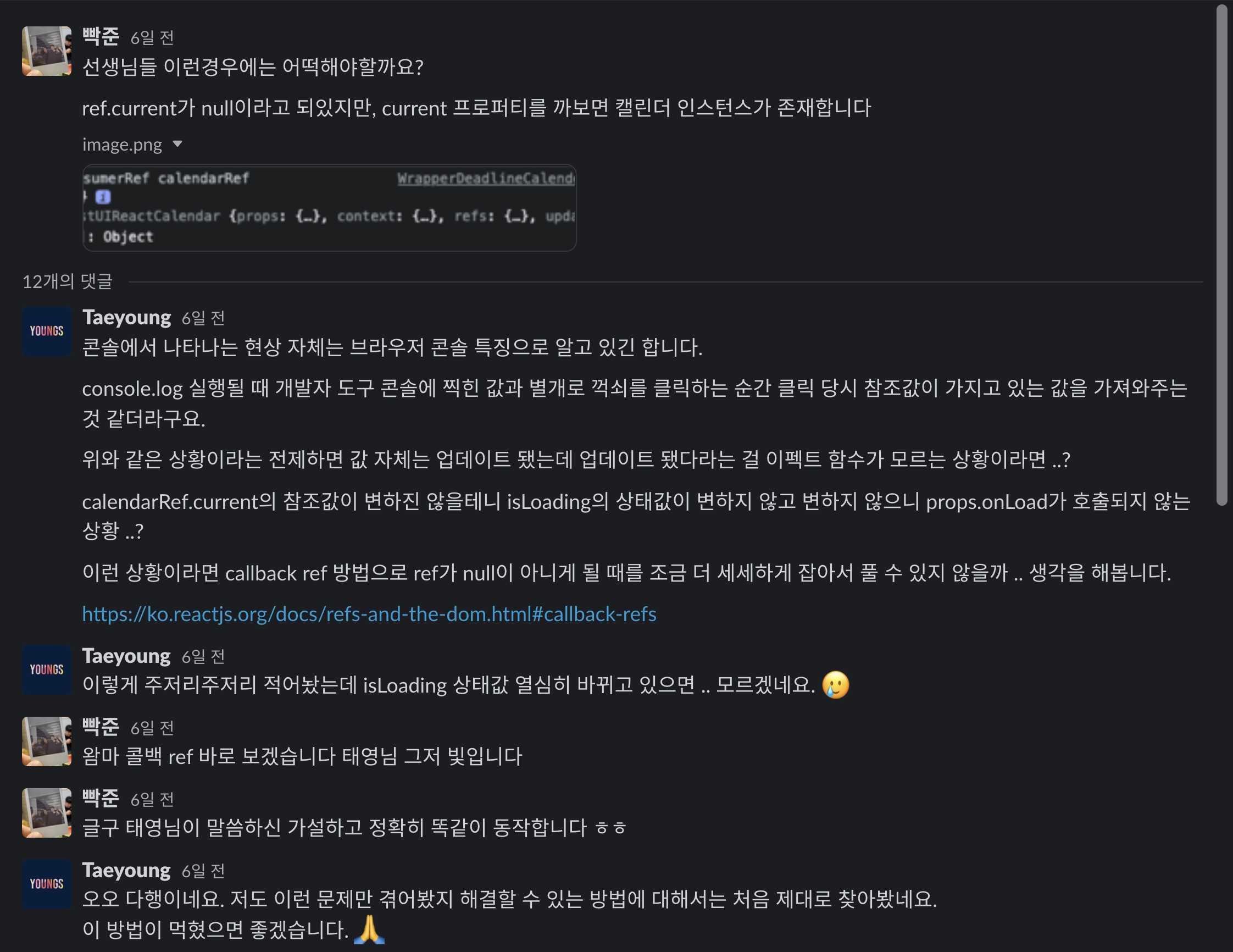 그 중 노마드코더의 Taeyoung님께서 callback Ref 공식문서 베타문서를 사용해보는게 어떠세요? 라고 해주셨고 바로 찾아보았다.
