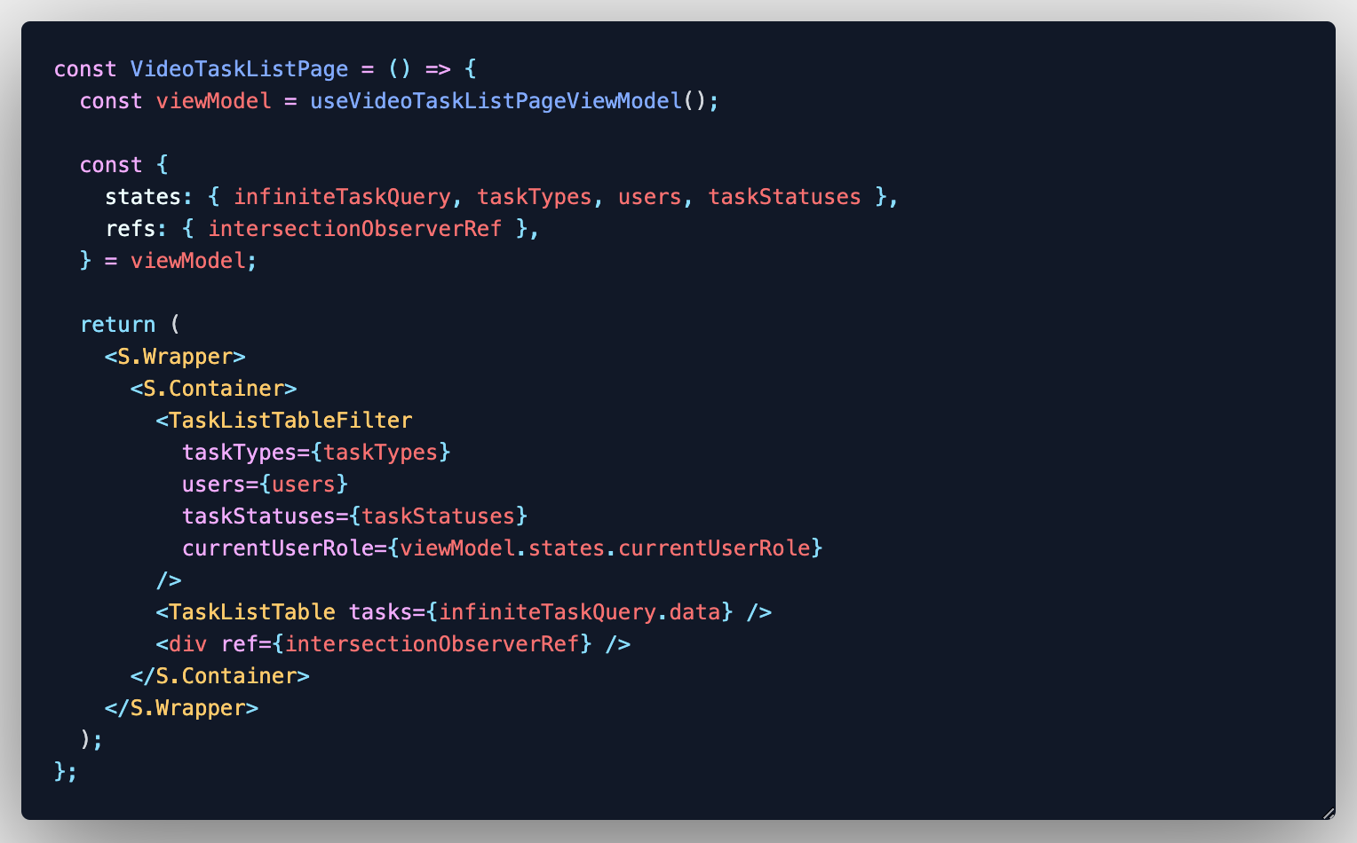 컴포넌트 구현부를 viewModel로 정의하고 리턴부(JSX)를 view로 정의했습니다.