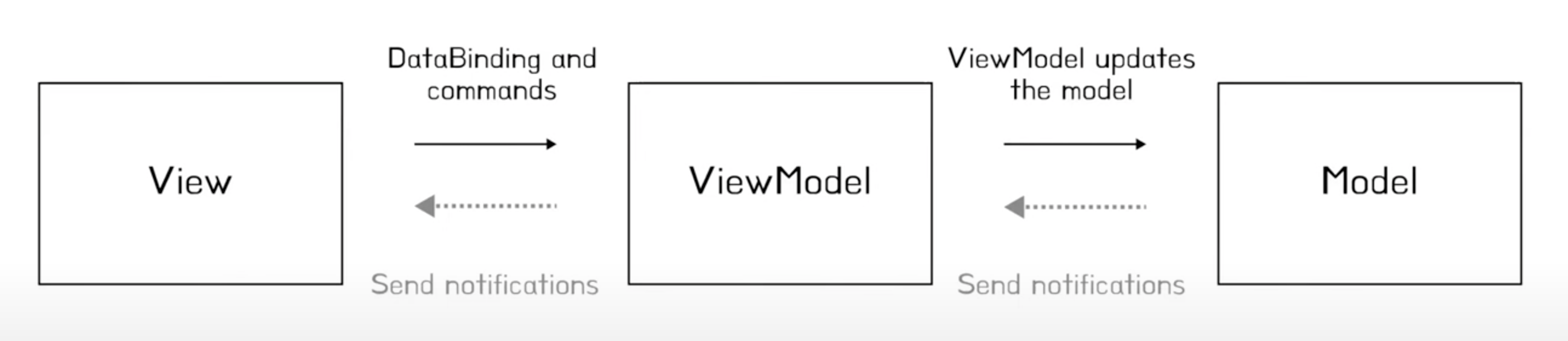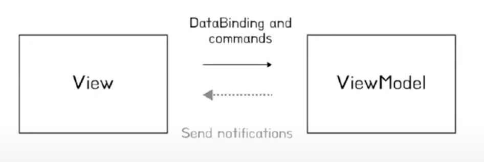 model은 요청을 받고 데이터를 변경하고 viewModel에게 Send Notifications 요청을 날리고, viewModel은 구독하고있는 model의 변경된 데이터가 변경되었다고 view에게 Send Notification 요청을 날립니다.