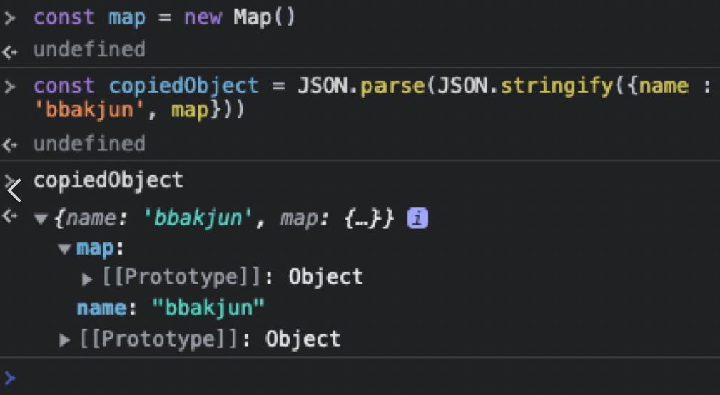 자바스크립트가 제공하는 데이터타입을 포함은 하지만 포함하지 않는 데이터 타입을 JSON객체를 사용하여 복사할 수 없기때문이다